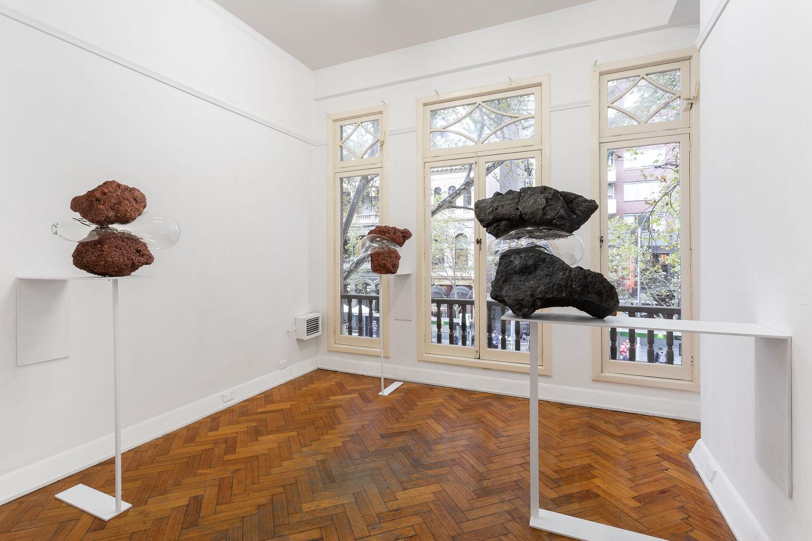 Simone Slee: rocks holding up presented a suite of sculptural assemblages that continued Slee's ongoing investigation into the conceptual conditions and problems of sculpture. As with earlier works, she demands complicity from particular objects that she constructs and composes. Slee doesn't just make her materials the subject of art, in this case she expects her rocks and blown glass to reciprocally perform an action of propping or holding. The materials themselves became accomplices in her questioning of how things might be held up (and conversely held down).