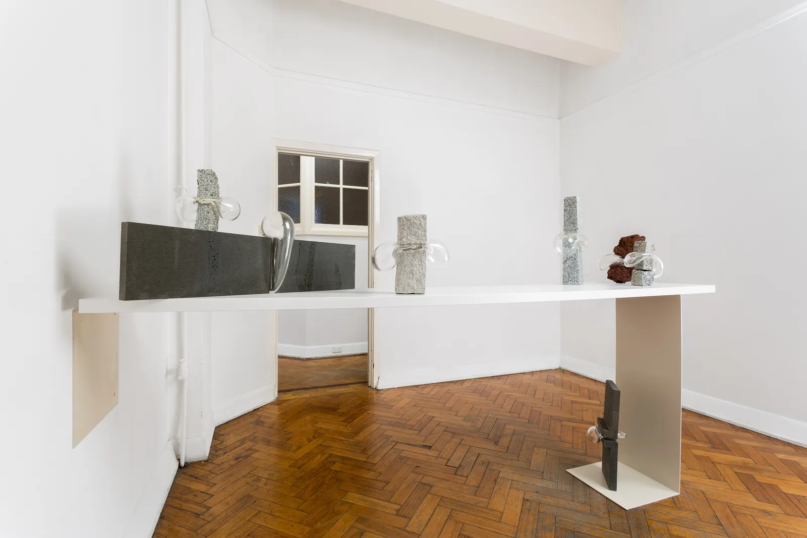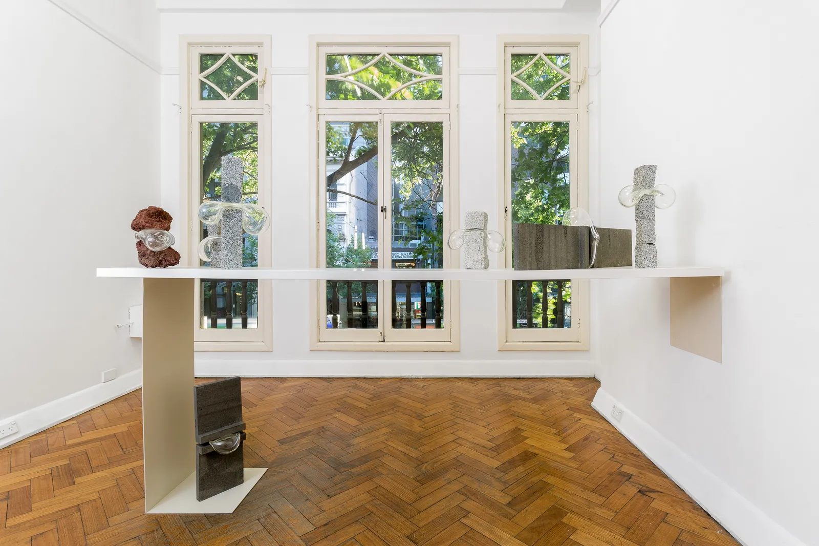 Simone Slee's third solo exhibition with the Sarah Scout Presents, rocks and things, happy to help, continued the artist's investigation into the role of things that are happy to help her with the problems of sculpture. Rocks (amongst other things) became Slee's accomplices in the fabrication of new sculptural assemblages; questioning what it is that holds up, and conversely what holds down. For rocks and things, happy to help Slee presented a series of sculptural objects and video works developed following a residency undertaken at Berlin Glas e.V., as part of Australian Now-Germany 2017.