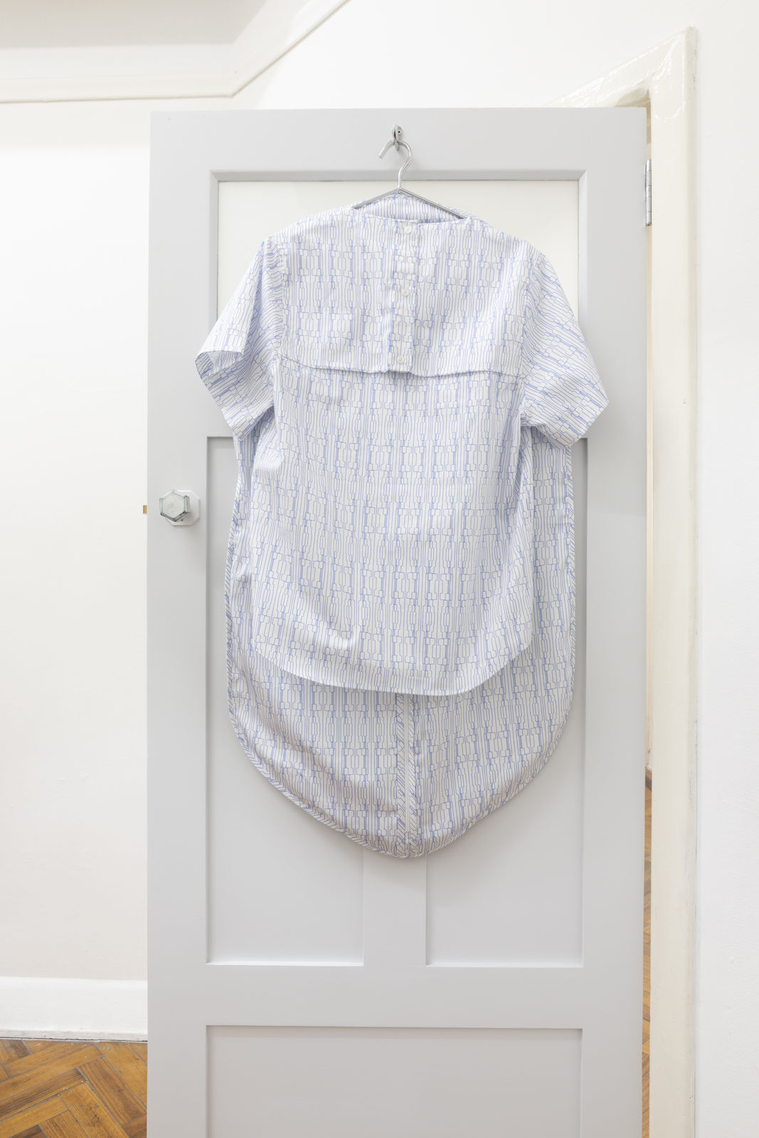 Variables is an exhibition of desks, door and shirts by Spiros Panigirakis that explores how bureaucratic systems and problematic masculinities are expressed in the design of fashion and furniture. The project uses Franz Kafka’s novel The Trial as a starting point, interpreting characters’ visceral experiences within various authoritarian structures, queering the narrative, and challenging some of the masculine archetypes of the original text.